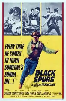 Black Spurs is a 1965 American Western film directed by R. G. Springsteen and written by Steve Fisher. The film stars Rory Calhoun, Linda Darnell (in her final film role), Terry Moore, Scott Brady, Lon Chaney Jr., James Best, Richard Arlen, Bruce Cabot and scenes with James Brown and DeForest Kelley. The film was released on June 25, 1965, by Paramount Pictures.[1][2]