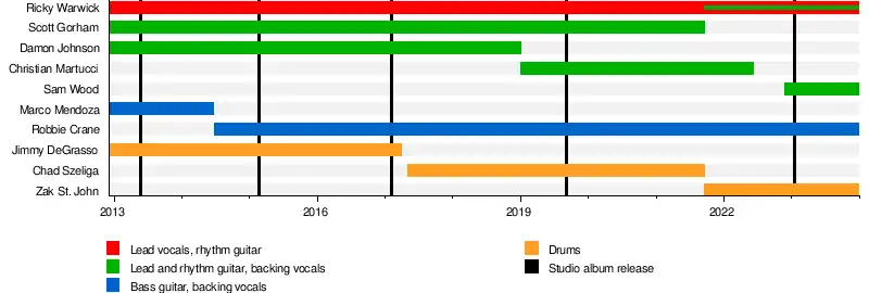 Black Star Riders is fronted by Ricky Warwick, and originally featured lead guitarist Scott Gorham and bass guitarist Marco Mendoza. Mendoza was replaced by Robbie Crane in 2014. Drummer and founding member Jimmy DeGrasso left the band in March 2017,[6] and was replaced a few weeks later by Chad Szeliga. Another founding member, lead guitarist Damon Johnson, left the band at the end of 2018 to be replaced by Christian Martucci. Gorham and Szeliga left the band in September 2021, the latter being replaced by Zak St. John. Gorham was not replaced, leaving the band as a quartet. Martucci left in June 2022, and was replaced in November by Wayward Sons guitarist Sam Wood.