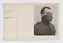 The German army used chlorine as a poison gas for the first time against Allied troops at the Second Battle of Ypres on 22 April 1915.[1] As an immediate response, the British began issuing cotton wool wrapped in muslin to its troops by 3 May.[2] This was followed by the Black Veil Respirator, invented by John Scott Haldane. The Black Veil was a cotton pad soaked in an absorbent solution which was secured over the mouth using black cotton veiling.[3] The mask was treated in a solution of sodium hyposulphate, sodium carbonate, glycerine and water.[3] The solution retained sufficient moisture so that it was unnecessary to dip the mask in a solution prior to use, so long as it was stored in its purpose-built waterproof satchel. The veiling could be drawn up to cover the eyes, providing some protection against lachrymatory agents; however, the mask itself still only provided limited protection against chlorine gas.[4]