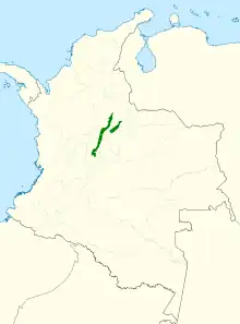 The black inca is endemic to Colombia. It is found on the west slope of the Eastern Andes from southeastern Santander and western Boyacá departments south into western Cundinamarca Department, and also on both slopes of Serranía de los Yariguíes in Santander. It mostly inhabits the interior of humid montane forest, especially those dominated by oaks, but males are also found in fragmented forest and other human-modified landscapes. In elevation it ranges between 1,200 and 2,800 m (3,900 and 9,200 ft).[6]