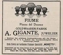 In jewelry, blackamoor figures usually appear in antique Venetian earrings, bracelets, cuff links, and brooches (Moretto Veneziano). Blackamoor jewelry is also traditionally produced, based on legend found in Fiume, such as earrings and brooches under the name Morčić or Moretto Fiumano.[4][5][6]