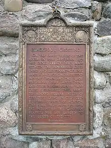 The crossing became an important place in Canadian history when Treaty 7 was signed here between the native nations of what is now southern Alberta and the Canadian government on behalf of the Crown in 1877. It was also here that Crowfoot, chief of the Siksika, is believed to have died and been buried. As well, Poundmaker, a Cree chief who had been ceremonially adopted by Crowfoot to create peace between the Blackfoot and the Cree, was also buried here until being moved in 1967. In 1925 the traditional gathering site and the treaty signing site were declared National Historic Sites of Canada by the federal government's Historic Sites and Monuments Board of Canada.[1] In 1972, the earthlodge village was also declared a national historic site.[2]