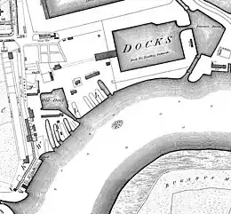 Blackwall Rock was located a short distance upriver of Blackwall Stairs, the southern end of a causeway from Poplar High Street which crossed extensive marshland, between the entrances of the West and East India Docks.[4] The rock was always a hazard to river traffic,[1] as it sometimes lay less than 3 feet (1 m) below the surface at low tide.[5] The entrance to the West India Docks, just to the south-west of the rock, was substantially obstructed by the reef upon the docks' opening in 1802.[6] In 1803, in his Strictures on the Alarming Progress of the Blackwall Rock in the River Thames, Robert Edington wrote that he surveyed the rock under the direction of the Corporation of the City of London's harbourmaster, Captain John Raymond Snow.[7] Prior to his survey, Edington was under the impression that the rock was 40 by 30 feet (12.2 m × 9.1 m);[8] Abraham Rees's Cyclopædia, published shortly before Edington's survey, had given these measurements.[9] Rees asserted that newspaper reports of one of Thomas Boddington's West Indiaman vessels being wrecked on the rock were incorrect, and that the relatively recent installation of piling and booms prevented ships from coming near the reef.[9]