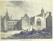 Blackwell Hall was originally a buttressed stone hall adjacent to the Guildhall in private occupation dating from the early 13th century. In 1395, the City of London Corporation purchased it from the de Bankwell family (from which it derives its name) and it was established as a cloth market under Dick Whittington's first mayoralty in 1397 in order to provide the first place where non-citizen and foreigners could buy and sell cloth.[1] It was rebuilt in 1588 and again after the Great Fire of London. It was demolished along with the chapel in 1820.[2]