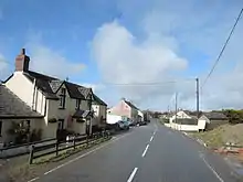 Looking north in Blaenwaun along the main road with Tafarn Yr Oen on the left hand side
