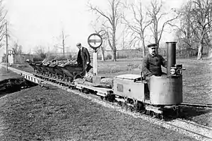 The track was laid in 1903 by Charles William Bartholomew (1850–1919) on his estate at Blakesley Hall. He was a wealthy civil engineer and landowner, major shareholder of the Great Central Railway and the East & West Junction Railway (E&WJR), self-proclaimed squire of the communities of Blakesley and Woodend. It was inaugurated in 1903 with a Cagney steam locomotive. In the following year, 1904, another Cagney steam locomotive was temporarily used on the track, which is now on display at the Strumpshaw Hall Steam Museum in Norfolk. In 1905, the petrol locomotive Petrolia was built and put into operation. The route was extended in 1909 to the bungalow of the farm, while a large part of the circle and the wye were dismantled. The locomotive Blacolvesley was delivered on 11 September 1909. The Cagney was then lent to the Sutton Hall Railway.[2]