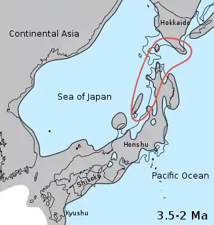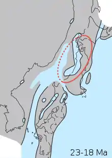Hypothesized paleodistribution of clade, that includes of what is nowadays genus Blanfordia (Blanfordia simplex, Blanfordia japonica, Blanfordia bensoni) and "Fukuia" ooyagii on the northern part of the Japanese archipelago in Early Miocene (23-18 Ma).