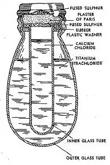 The Blendkörper 2H was similar to the earlier Blendkörper 1H in concept and construction. The Blendkörper 2H was roughly the size of a light bulb but made from thicker glass and consisted of two glass bulbs filled with liquid and sealed with plaster of paris. The grenade was used to temporarily blind the crews of pillboxes and vehicles. When the bulb burst the mixture vaporized and gave off a thick white smoke. The outer vial contained 250 g (9 oz) of titanium tetrachloride while the inner vial contained 25 g (0.88 oz) of calcium chloride. A downside of the Blendkörper 1H was that it didn't work well with low humidity and this was addressed by the Blendkörper 2H. A notice on the side of the container for four grenades, says that they are suitable for use at temperatures down to -40°.[2]