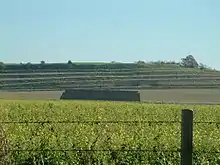 The rampart was built a considerable time later than the original timber palisade that defended the early settlement.[8] The rampart was originally 6.4 metres (21 ft) wide, with a 4 metres (13 ft) gap between the inner and outer retaining timber supports.[9] The rampart was built from chalk packed firmly between the timber retainers.[10] The second phase of the rampart was of the "Low Dump" type, with an asymmetrical cross-section and a shallow incline towards the rear, with a much steeper front dropping directly into the ditch.[11] This replaced the earlier filled-timber wall-and-fill style of rampart.[12] In the eastern part of the hillfort, the rampart has been badly damaged by ploughing, and in places destroyed. In the western portion, part of the rampart survives as a sunken lynchet, and the ditch there survives as a flat terrace.[2] In the first phase of the rampart, the ditch was approximately 1.5 metres (5 ft), but when it was recut for the second phase it was deepened to 4.6 metres (15 ft).[2] The hill features a number of unusual terraces or lynchets, the age and function of which is unknown, although they are believed to post-date the Iron Age.[2]