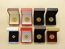Donors with three or ten blood donations receive their certificate of honor directly on site. Donors with 25 donations will receive their badge of honor on site and will be sent their certificate. In the local associations, donors are honored from the 50th donation. From the 75th donation, the design of the badge of honor differs in the form of a medal with the inscription "Donate blood save lives", a cross in a stylized drop of blood and a garnet in a double wreath. In addition, donors who donate more than 75 blood receive an invitation to a major cross-district donor honor.[1]