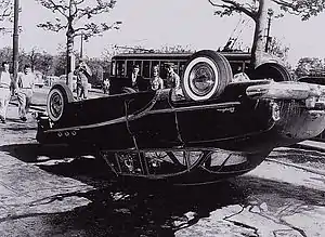 With the eruption of gunfire, many protesters panicked and attempted to flee the plaza, leading to further clashes with police. Retreating protesters overturned and set fire to dozens of American-owned military vehicles parked along the road. With chants of "Yankee go home!" (yankii go homu), they also attacked American bystanders, including reporters and American soldiers.[1] Three American GIs were hurled into the palace moat and stoned before they were saved through the intercession of other Japanese.[1]