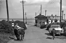 The station was first opened on 16 July 1874 by the Minehead Railway as Blue Anchor.[1] Suggestions that it was called 'Blue Anchor Excursion Platform' or 'Bradley Gate' have been shown to be incorrect.[2][3][4] In 1874 it had only one platform, which faced the beach, but in 1904 the second track and platform were built by the Great Western Railway, which had taken over the railway in 1897. At the same time the signal box was opened to control new gates on the level crossing which carries the Carhampton road across the line at the west end of the station. A goods yard was opened west of the level crossing in 1913.[5]