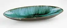 Blue Mountain Pottery items feature a unique, trademarked glazing process known as "reflowing decorating." Two different liquid glazes, one light and one dark in colour, were applied. During the firing process the glazes would run, creating streaking patterns unique to each piece.