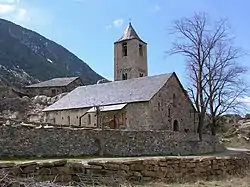 The Romanesque church of Sant Joan dates from the 12th century. It has three naves, and a bell tower, in the Lombard style, attached to the nave on the south side. Two of the three storeys are original story. It also has a notable a collection of paintings of the 12th century, depicting various mythical animals. The originals, the Paintings from Sant Joan in Boí, are in the Museu Nacional d'Art de Catalunya in Barcelona, and there are reproductions in the church.