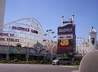 The hotel rejoined the Holiday Inn chain through a new franchise deal later in 1994,[30] and a Coney Island theme was added shortly thereafter.[31] A carnival facade was built in 1995, adding non-functional replicas of a parachute drop, roller coaster, and Ferris wheel, as well as a giant clown face and retail shops.[31][32][33][34] The casino was also expanded,[35] and a 15-floor, 451-room tower was finished in 1996.[32][36] That year, Jacobs Entertainment, Inc. made a $9 million investment in the Boardwalk.[37] In 1997, the resort added the 370-seat Surf Buffet,[38] which ran a television commercial starring professional boxer Butterbean.[39][32][40]
