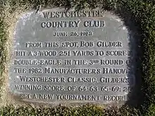 Gilder may be best remembered for his double eagle in 1982 at the Manufacturers Hanover Westchester Classic. It took place during the third round, at the 509-yard (465 m) par-5 18th hole of the Westchester Country Club, just north of New York City.[4] Gilder used a 3 wood from 251 yards (230 m) away; his second shot carried 230 yards (210 m), landed softly on the green, and rolled into the cup. A plaque on the 18th fairway commemorates the feat.[5] It gave him a 192 (−18) for 54 holes, which tied a tour record. It also doubled his lead to a comfortable six strokes; he won the tournament by five strokes on Sunday with a 69 to finish at 261 (−19).[6]