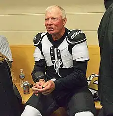 Robert Earle Clarke OC (born August 13, 1949) is a Canadian former professional ice hockey centre who played his entire 15-year National Hockey League (NHL) career with the Philadelphia Flyers and is currently an executive with the team.[1] Popularly known as Bobby Clarke during his playing career and as Bob Clarke since retiring as a player, Clarke is acknowledged by some as being one of the greatest hockey players and captains of all time.[2][3] He was captain of the Flyers from 1973 to 1979, winning the Stanley Cup with them in both 1974 and 1975. He was again captain of the Flyers from 1982 to 1984 before retiring. A three-time Hart Trophy winner and 1987 Hockey Hall of Fame inductee, Clarke was rated number 24 on The Hockey News' list of The Top 100 NHL Players of All-Time in 1998.[4] In 2017 Clarke was named one of the '100 Greatest NHL Players' in history.[5]