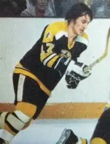 Schmautz was subsequently traded to the Boston Bruins midway through the 1974 season.[3] Playing under Bruin coach Don Cherry, Schmautz developed into an accomplished forechecker and backchecker, usually playing right wing on a line with future Hall-of-Famer Johnny Bucyk and versatile center Gregg Sheppard.[4] He spent five seasons with Boston in all, finishing ninth in the NHL in game-winning goals in 1976 and 1978.[1] Schmautz scored the overtime goal for Boston in Game Four of the 1978 Stanley Cup Finals versus Montreal to level the series at two games apiece.[5] A photograph of Schmautz celebrating his goal was used as the cover photo for the Bruins' 1978–1979 media guide.[6] Overall, Schmautz scored 26 playoff goals for Boston – the same total as Bobby Orr.[5][7] At the time of Schmautz's death, he ranked 20th in Boston history with 56 playoff points. Schmautz was known for having perhaps the great snap shot in the game.