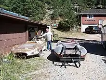 The first real production cars, begun in mid-1959 were the XP-5s, on the same wheelbase. The Bocar XP-5 had a glass-reinforced polyester body surrounding a welded moly-tube space frame. Up front was a beefed-up Volkswagen rear suspension. Power customarily came from a 283-cid Corvette V8 engine, producing 290 hp (216 kW) at 6200 rpm.[1] A small number of XP-5s were sold with Triumph frames, typically keeping their original suspension and brakes.[2]