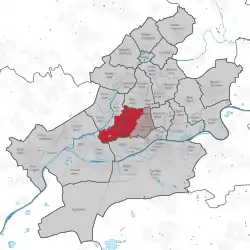 Location of Bockenheim (red) and the Ortsbezirk Innenstadt II (light red) within Frankfurt am Main | |