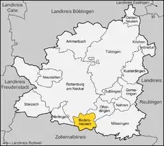 Bodelshausen is a municipality in the district of Tübingen in the German state of Baden-Württemberg.