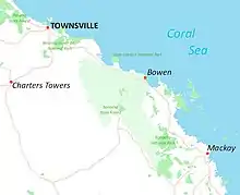 The main settlements in this subregion are Bowen, with Collinsville/Scottsdale immediately outside the central-western part of the subregion boundary. Coal mining is a major industry at Collinsville, and a dedicated railway line runs from there to a coal loading facility at Abbot Point. There Bowen Developmental Road is the sealed road between Bowen and Collinsville which then continues southward. The Bruce Highway passes through the coastal area in the north-east. Other roads are gravel, with low-level concrete stream crossings.