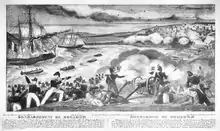 The French fleet arrived in the Bay of Mogador on August 11, 1844, but the weather was so bad that they had to wait, breaking their anchors and unable to communicate even between themselves.[3] Once the weather abated, the French Navy first took up firing positions on 15 August.[3] They were fired upon by the Moroccan batteries first upon taking their positions. After one hour, the French batteries responded, and exchanges lasted for about 3 hours.[3][4] The batteries of the city were silenced one by one, but the batteries on Mogador island remained active, requiring a landing to clear them out.[4]