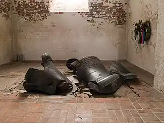 Another memorial to the people who were killed or displaced by the bombing is found in the Lübeck Ehrenfriedhof (cemetery) where there is a cenotaph and memorials to both wars. The memorial of the bombing of Lübeck is a statue by the sculptor Joseph Krautwald, who was commissioned in the 1960s to produce a work that reflected the experience of the victims. The statue, named Die Mutter (the mother), was carved from local coquina and shows a mourning woman with two little children. It is placed in the center of the circle surrounded by the tombstones of those who died that night.[15]