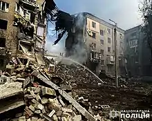 Around 3am on 9 October, 12 Russian tactical missiles were launched against civilian infrastructure in Zaporizhzhia. Most missiles hit both high-rise buildings and residential houses, with a nine-story building being partially destroyed after the attack. A further five high-rise buildings, 20 residential houses and four schools were damaged alongside 20 cars. A total of 13 civilians were killed in the attack, while 89 more were injured.[40]