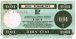 Bon towarowy PeKaO (or simply Bon PeKaO) cheques were substitute legal tender (complementary currency) used in the People's Republic of Poland. The Polish government, needing hard foreign currency, introduced them in 1960. Citizens of Poland had to exchange foreign currency they had into these notes (bony in plural), issued by the government-controlled Bank Pekao. They were only accepted in special shops in Poland (Pewex, Baltona) where one could buy restricted, imported goods. Outside of these shops and the entire country, bony had no value and were not regarded as legal tender.