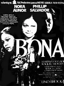 Bona is a 1980 Filipino drama film written by Cenen Ramones and directed by Lino Brocka. The film tells the story of a fan becoming infatuated with the bit actor from a movie but the endless infatuation comes with unfortunate results. The film stars acclaimed actress Nora Aunor as the titular character and Phillip Salvador, one of Brocka's frequent collaborator actors, as the bit actor Gardo.