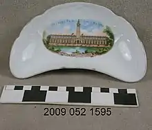 A bone dish is a piece of tableware designed to nestle against a round plate. They are crescent shaped and were commonly used in the 19th century to hold fish or chicken bones discarded from the diner's main plate.[1][2] Their shape also makes them convenient to use as a side plate to serve a cold salad with hot food.[3][4]