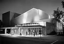 The theatre was designed in Art Moderne style by Denver architect John K. Monroe.[3][4] The one-story structure, covering 66,000 square feet (6,100 m2),[5] was faced in cream-colored brick and trimmed in buff-colored terra cotta and red sandstone.[3][1] Below the "wing-swept" marquee, a contoured aluminum canopy overhung the entrance.[3][6]