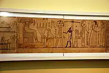 The book derives from Thebes and is dated to the Ptolemaic period, probably around 200 BC. The papyrus was among the grave goods of the Singer of Amun, Nehem-es-Rataui. The Papyrus was written in Hieratic script, completely in black ink. Originally the 21 centimetre high document had a length of 715 centimetres - that is, 15 pages. As a result of damage in the Second World War, when the central city of Hanover was bombed and the Kestner Museum took heavy damage, it only survives in the form of three fragments with a length of 1.64 m, which includes the central scene. The very tight combination of the important Egyptian deities in the central scene is notable. Osiris sits in judgement, Anubis and Horus weigh the heart of the deceased, Thoth records the result and the monstrous Ammit waits to devour the ba of the deceased in the event of a negative judgement. On a lotus bloom between Osiris and Thoth stand the four sons of Horus. The deceased is at the right, accompanied by two goddesses. At other points, the text is broken up by small images, mostly of the Horus falcon. Another large image is located to the left of the main image, divided into four smaller images.