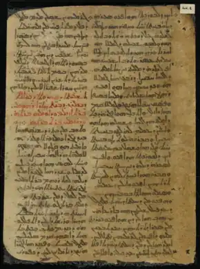 The script of the text is similar to that of the Codex Climaci Rescriptus from Edessa.[6] The table of contents of the Book is preserved almost in its entirety.[7][8] It contained 49 chapters.[5] Each chapter is headed by a red rubric, although the name of the Himyarite king Masruq is never in red and is often deliberately written upside down.[4]