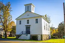 Borodino Hall, also known as Borodino Grange Hall, is a building in the hamlet of Borodino, New York. It was listed on the National Register of Historic Places in 2006.[1] Borodino Hall was built in 1835 by the First Religious Society of Borodino, and served as a church until 1868. It is a two-story building with a gabled roof on a high stone basement. It is of heavy timber-frame construction designed in the Federal style. The building was sold in 1868, and a stage was added to the interior around that time, converting it into a hall. In 1871, a performance of "Uncle Tom’s Cabin" was presented there by the Borodino Dramatic Society. At some time after this, the building became the Spafford Town Hall, a purpose it served until 1912. In that year the Grange chapter #1272 began meeting in the Hall, and they purchased it in 1919. Water service, a kitchen and restrooms were added in the early 1950s. The Spafford Area Historical Society purchased the building in 1997. It currently serves as a community center.[2]