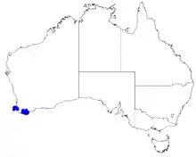 The red boronia is usually found growing near streams between Busselton and Albany in the Esperance Plains, Jarrah Forest, Swan Coastal Plain and Warren biogeographic regions of Western Australia.[3]