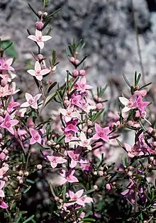 Boronia rosmarinifolia, commonly known as the forest rose,[2] is a plant in the citrus family Rutaceae and is endemic to eastern Australia. It is a shrub with many branches, simple leaves and pale to bright pink flowers arranged singly in leaf axils.