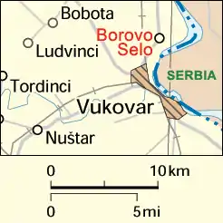 Borovo Naselje (Serbian Cyrillic: Борово Насеље; lit. 'Borovo Settlement') is a Vukovar borough located on the right bank of the Danube river in the Croatian region of Slavonia, 4 kilometers northwest of Vukovar town centre; elevation 90 m. The economy is based on rubber and shoe industries. The routes D2, D55 and D519 intersect in Borovo Naselje, connecting Vukovar to Osijek, Vinkovci and Dalj, respectively. The suburb originally developed as a part of Borovo village and its cadastral community but was subsequently separated and incorporated as a part of the town of Vukovar in 1980's.