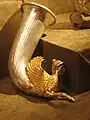 - Three rhyta, each a different size, and with a different base. The largest has a figure of a sphinx and bears the inscription: "[Belongs to] Cotys from [the town of] Beos.", as well as the name of the craftsman, Etbeos.[5] The second has a figure of a horse, and the third, the smallest, has a bull. Each are half figures.