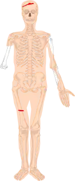 Scheme of Borremose Man's preserved body parts shortly after his discovery in 1946: red = fractures, beige = soft tissue, grey/white = bones.