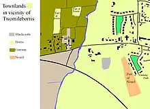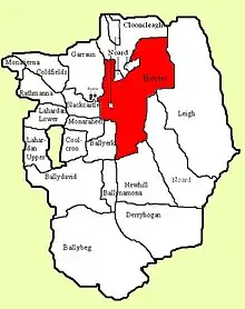 The townland illustrates how Borrisleigh civil parish is an interesting complex of enclaves and exclaves. It is bounded on the north by two of the four exclaves that belong to the neighbouring townland of Noard while another forms an enclave within Borris,[4] lying just to the south of the historic core of the village of Two-mile Borris. The current Ordnance Survey map of the area shows that the ancient perimeter of this small enclave (which is just over three acres in size) is still present on the ground,[5] as the boundary of a field which lies just to the west of the modern housing area called Fanning Park and to the east of the site of an old graveyard and the ruins of the castle.