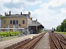 After the Second World War, Großbothen lost importance because of a break in the line to Wurzen and the dismantling of the Borna–Großbothen line.[20] Signal box 2 was closed by 1980; the western end on the Mulde Valley Railway side received electrically-actuated, remotely-controlled points and colour light signals; these were connected to signal box 1. Shortly after 1990, the middle of the three railway platforms of the Mulden Valley Railway was closed. Traffic on the Colditz–Großbothen section of the Mulden Valley Railway was discontinued on 27 May 2000. In the rationalisation of the facilities, in preparation for the construction of the electronic interlocking system, the connections between the Mulde Valley Railway and the Borsdorf–Coswig railway at the eastern end were omitted. Since 2010, an Alcatel electronic signal box has been put into operation; it is controlled from Geithain station. The central platform of the three platforms on the Borsdorf–Coswig side was retained, but the points were locked, which made it no longer usable. Since 2014, there are again three platform faces on the Borsdorf–Coswig line side of the station and one of the tracks leased to the DRE on the Mulde Valley Railway is accessible by train to and from Grimma ob station. Signal box 4 was not included in the electronic signalling and was retained.