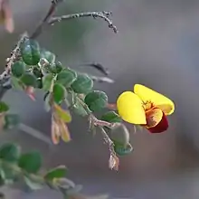 Bossiaea buxifolia is a prostrate to weakly erect shrub that typically grows to a height of up to 50 cm (20 in) tall, although sometimes as high as 1.3 m (4 ft 3 in) and has softly-hairy stems. The leaves are arranged alternately, elliptic to egg-shaped or more or less round, mostly 2.5–5.0 mm (0.098–0.197 in) long and 2–5 mm (0.079–0.197 in) wide on a petiole 0.2–0.5 mm (0.0079–0.0197 in) long with narrow triangular stipules 1–2 mm (0.039–0.079 in) long at the base. The flowers are usually borne on short side branches, each flower 6–10 mm (0.24–0.39 in) long and borne on a pedicel 6–10 mm (0.24–0.39 in) long with a few small bracts and bracteoles 1–2 mm (0.039–0.079 in) long at the base. The sepals are 3–6 mm (0.12–0.24 in) long and joined at the base with the upper lobes 1.5–2.5 mm (0.059–0.098 in) long and the lower lobes slightly shorter. The standard petal is yellow with a red base, a darker colour on the back and up to 9 mm (0.35 in) long, the wings yellow and orange and slightly shorter than the standard, and the keel dark red to purplish and less than 6 mm (0.24 in) long. Flowering occurs from spring to early summer and the fruit is a narrow oblong pod 15–30 mm (0.59–1.18 in) long.[2][3][4][5]