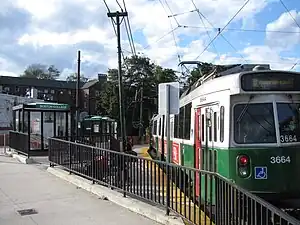 In the early 2000s, the MBTA modified key surface stops with raised platforms for accessibility as part of the Light Rail Accessibility Program. Portable lifts were installed at Boston College around 2000, along with a wooden mini-high platform (for level boarding on older Type 7 LRVs) on the inbound side.[15][16] By 2005, the MBTA planned to relocate the station to the median of Commonwealth Avenue, just east of the Lake Street intersection.[17] Boston College later agreed to aid the project financially and to donate land to widen Commonwealth Avenue to accommodate the station.[18] New raised platform allowing level accessible boarding on newer low-floor Type 8 LRVs were completed on the existing site in 2009 at a cost of $296,000.[19]