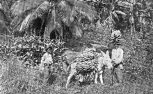 "Andrew Preston chose the West Indies as the site for his entry into the banana exporting business. The Boston Fruit Co. also moved into the production end of the business when it bought plantations in Jamaica. The fact that ... Preston owned [the] sources of supply differentiated [him] from others in the business. Until then, it was unheard of for companies to deal at the supply end of the banana trade."[8] "Along the northeastern and eastern coast of the island of Jamaica, extensive tracts of land are cultivated by the natives, on which are raised the yellow Jamaica banana. The Boston Fruit Company own about 10,000 acres of this land, and under the supervision of Capt. Baker, who resides there, bananas are raised for the Company's use. Since the cultivation of Jamaica fruit has been taken into the hands of Boston parties, the quality has improved steadily, and this year handlers of this fruit claim that the quality is the best that ever came from there, and they attribute this to the careful handling of the bananas all along the line, as well as their careful cultivation."[6]