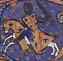 Bouchard used the coat of arms of the lords of Montmorency, or a cross gules, quarterly four eagles (alerions?) azure, attested (without tincture) in a heraldic seal used in 1225.[1]