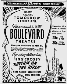 The theater, part of the Paramount Theatres chain, debuted with a matinee showing of Rhythm on the River, starring Bing Crosby and Mary Martin.