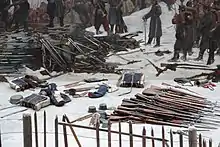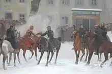The focus of the painting is upon the meeting of French General Justin Clinchant (to whom Bourbaki had given command of the Armée de l'Est) and the Swiss General Hans Herzog in front of the Hôtel Fédéral.[1] The rest of the scene shows a line of weary and wounded French soldiers trekking through a snow-covered valley to pile their arms under the supervision of the Swiss Bernese Battalion.[4][1] Some of the Frenchmen are being assisted by local residents and members of the Red Cross.[4] Rail lines and straight roads provide axes of perspective.[1] The circumference of the finished work, rendered in oil paint on canvas, is 115 metres (377 ft).[1] The panorama is unusual in depicting the tragic consequences of war, rather than the usual celebration of victory; it is also a celebration of Swiss neutrality and hospitality.[1]