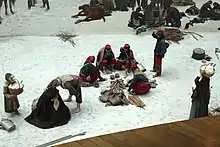 To prepare for the commission Castres spent the winter of 1876–77 at Verrières, sketching and painting the landscape to help him to reproduce it more accurately on the panorama.[1] Castres worked on the panorama for five months with a team of ten painters who went largely uncredited, though it is known that Ferdinand Hodler was among them.[5][6][7] Castres wanted to create a sense of atmosphere and so painted the panorama as if the viewer was within the scene, not looking down upon it from higher ground.[3] Three-dimensional objects are exhibited in front of the painting, these include figures, military equipment and a railway carriage.[8]
